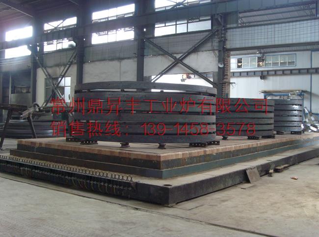 (5)炉底板:台车上安装有耐压抗高温的铸钢炉底板,以承载工件之用。为了防止工件加热后产生的氧化皮通过炉底板间的缝隙落入加热元件周围而造成加热元件损坏,因此炉底板与炉体接触处采用插入式接触。