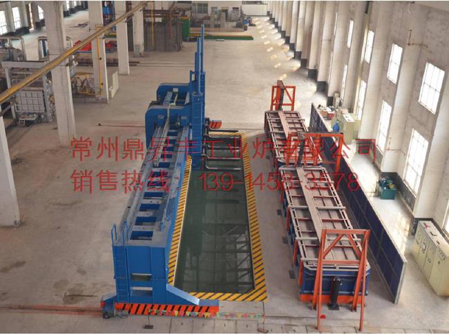 本套淬火机组有多台钟罩式电阻炉与一台淬火操作车组合为一个快速淬火机组生产线,一个机组可以根据用户的产量和工艺要求配套几台不同的炉型,炉子的数量和炉型可以自由组合,本生产线可满足不同的生产工艺如:淬火、回火、退火、调质等热处理工艺,炉温有1200℃,950℃,700℃等,每条生产线配有一台快速下水淬火操作车,该操作车可上下、左右、前后六个方向移动,工件热处理完成后,操作车迅速进入炉内将工件从炉膛内叉出,并快速落入水池或淬火液池内,整个过程在1分钟内完成,生产效率高,操作方便,从而保证了工件的淬火质量。